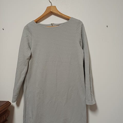 Harmaa, yksivärinen mekko, jossa pyöreä pääntie ja 3/4-pituiset hihat. Edessä kaksi paikkataskua. Materiaali on puuvillasekoitetta: 87 % puuvillaa, 9 % polyesteriä ja 4 % elastaania.