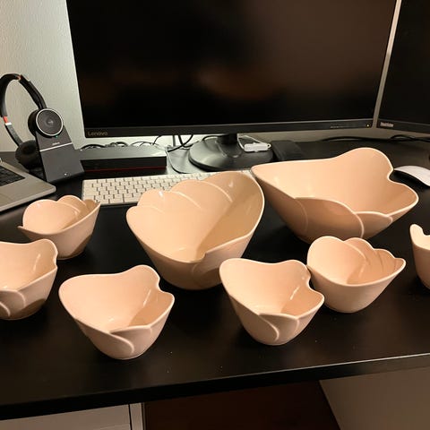 Valkoiset korkeus 9 cm, halkaisija 13 cm. 15 €/kpl. Kaikki 4 yhteensä 100 €. Postitus tai nouto