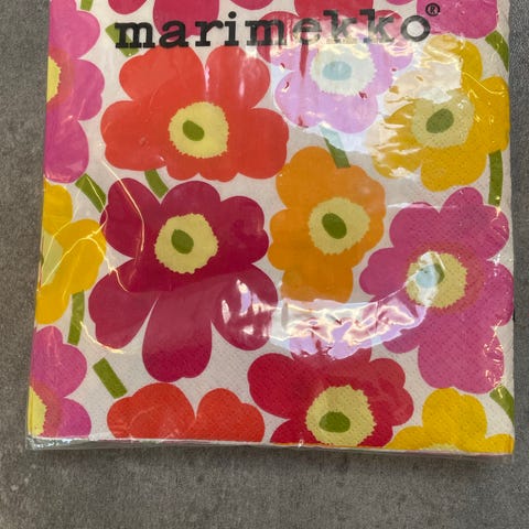 Marimekko kuviolliset lautasliinat. Pakkauksessa on useita erikokoisia, erivärisiä lautasliinapakkauksia, joissa on kukkakuviointi. Soveltuvat kattaukseen ja arki- tai juhlakäyttöön.