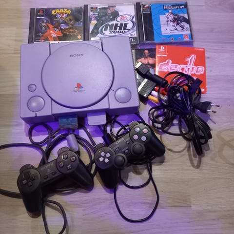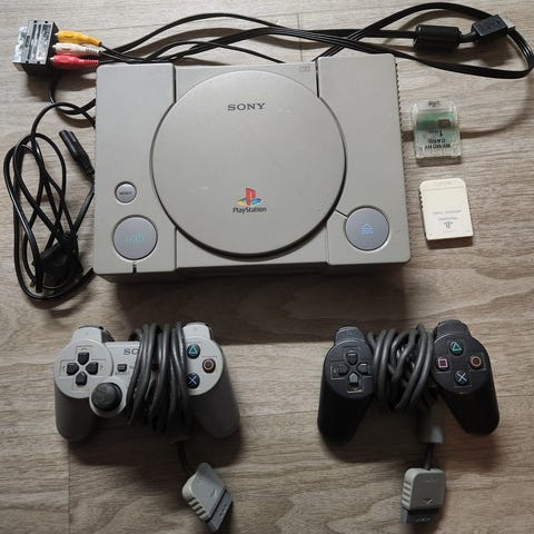 PS1 pelikonsoli ja boksi sekä DualShock -ohjain