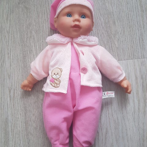 Hyväkuntoinen vauvanukke ja kantokori + pupu tutinpidike .