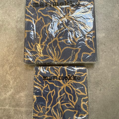 Marimekko lautasliinat, joissa sininen ja vaalea kuviollinen pinta. Lautasliinat sopivat kattauksiin ja juhliin tuomaan väriä ja kuviota pöydän ilmeeseen. Pakkaus näyttää olevan avaamaton muovikääreessä. Tarkka koko ja mallin nimi eivät käy ilmi kuvasta.