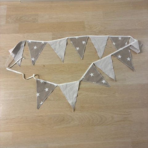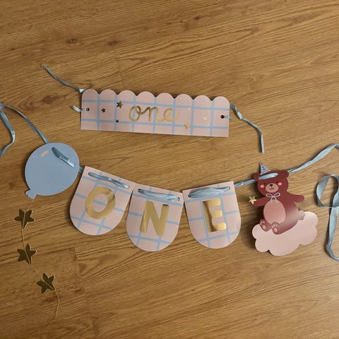Kangasviiri, jossa teksti "ONE" ja siniset kirjaimet. Viiri koostuu kolmesta juuttikankaisesta lippunauhasta, joiden reunoissa on sinisen ja vaaleansinisen sävyisiä nauhoja. Sopii esimerkiksi 1-vuotissyntymäpäivän koristeeksi. Nouto Nuottaniemestä tai kulkeutuu myös Omppuun