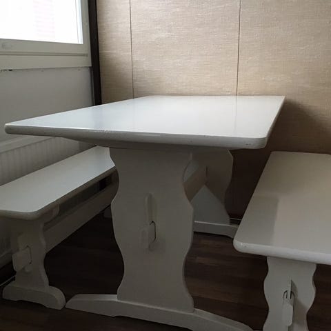 Elämää nähnyt pöytäryhmä. Pinta naarmuja ja reikiä löytyy. Kuvia saa pyytämällä. Tukevasti kiinni, ei nitise pahemmin. Omat kantajat. Nopea nouto etusijalla.