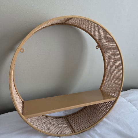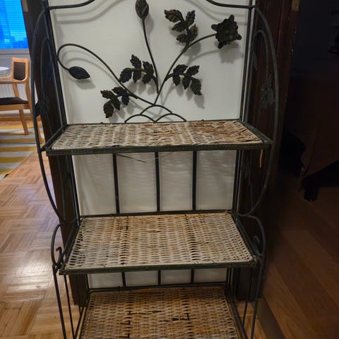 Ajan patinaa näkyvissä ja sivuista osa rottingeista katkennut. Tasoissa joidenkin astioiden jättämiä jälkiä. Meitä ei ole haitannut. Kaunis esimerkiksi lastenhuoneeseen. Yleisilme mielestäni edelleen kaunis.