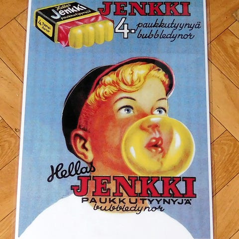 Laminoitu painokuva kokoa A4, alunperin ollut mainos 1950-luvulta, tässä uusvanha versio.