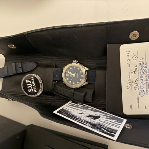 Mukaan tulee 3 SUF-ranneketta: Uusi Mesh, Ruskea nahka ja Musta Erikas. Lisäksi kuvissa näkyvä kaarevat tarvikemetalli ja kumi. Nahkapussi, alkuperäinen kortti ja huoltokortti & kuitti mukana.