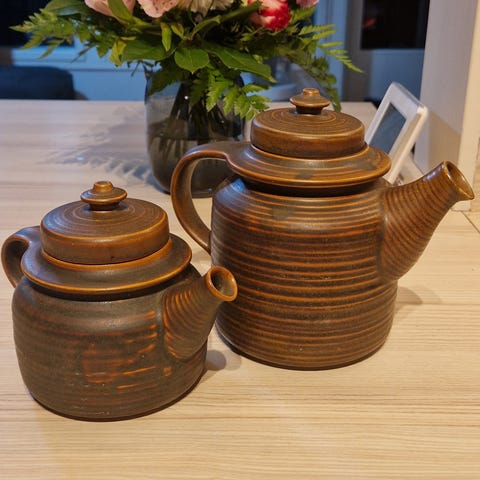 Keraaminen kannu ruskealla raidallisella pinnalla. Kannussa on kaatonokka ja korvallinen kahva, sopii esimerkiksi veden, mehun tai muiden juomien tarjoiluun. Soveltuu myös keittiön tai ruokapöydän käyttö- ja koriste-esineeksi.