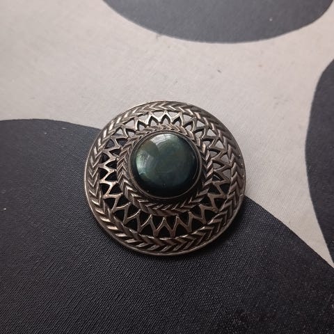 Kalevalan Uskelan solki rintakoru naisille, jossa pyöreä muoto ja keskellä spektroliitti korukivi. Rintakorussa on koristeellinen, punottua muistuttava reunakuviointi ja neulakiinnitys takana. Valmistettu hopeasta ja sopii käytettäväksi esimerkiksi vaatteiden, huivin tai jakun somisteena.