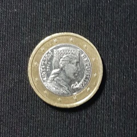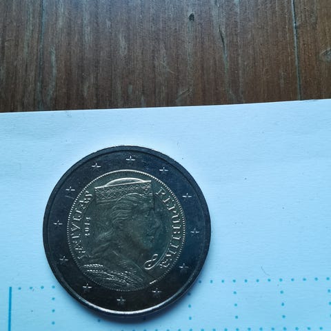 Kierrosta poimittu Latvian 2 euron kolikko v. 2014, jonka kuva-aiheena oleva Milda neito on peräisin vuoden 1929 5 latin hopeakolikosta.