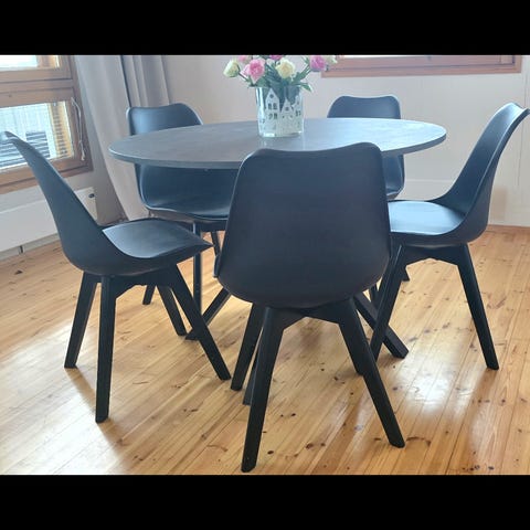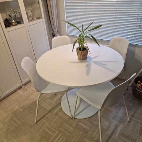 Myydään mieluiten settinä 2 tuolia ja pöytä. Pöytälevyssä pari pientä kolhua, näistä lisäkuva. Yleisilmeeltään kuitenkin siisti, eikä kolhut näy kauempaa. Pöytä purettu osiin, kaikki osat tallella. Tuolit saa pinottua päällekkäin.