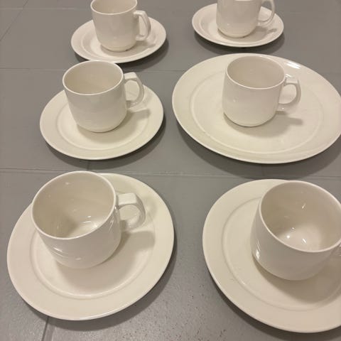 Arabian valmistamat Vappu kahvikupit sinivihreällä puhalluskoristeella. Koriste oli tuotannossa AA-mallin kahvikupeissa 1970-luvun alkuvuosina. Kupin korkeus on 5,8 cm, halkaisija 7,4 cm ja tilavuus 15 cl. Lautasen halkaisija on 13 cm ja korkeus 2,3 cm. Lautasessa on pieniä ruskeita läikkiä.
