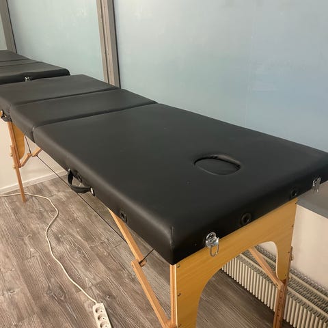 Quirumed-merkkinen hierontapöytä mustalla tekonahalla. Pöydässä on pehmustettu makuualusta, irrotettava tai säädettävä pääntuki sekä kasvoaukko. Runko on alumiinia ja korkeutta voi säätää jaloista.