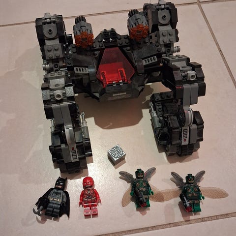 *setistä puuttuu laskujeni mukaan 3 tarraa. 1 tarra isomman ajoneuvon vaaleasta tasaisesta valkoisesta 1x3 ja 2 tarraa Batmanin kulkuneuvon takana olevista kuperista osista.