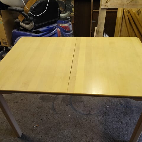 Pieniä käytönjälkiä, naarmuja ja kaksi kolhua pinnassa. Silti siisti ja näyttävä pöytä.