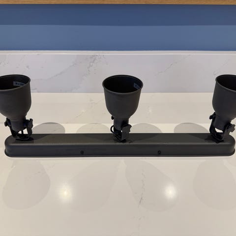 Vanha, mutta toimiva kiskoon asennettava valaisin. Tiedot: Nokia XTSA 65 10A 380V.