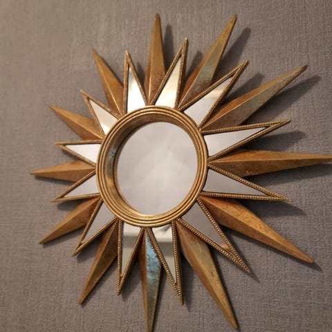 Upea peili. Kullankeltainen. Peippojen sulat - pauwenveren. Erittäin kaunis muotoilu. Hartsinen kehys. Mitat ovat seuraavat (+/-):Korkeus: 48 cmLeveys: 48 cmKaikki tuotteemme pakataan hyvin ja lähetetään vakuutettuna.Regency / auringonpeili / 1950-luvun sisustus