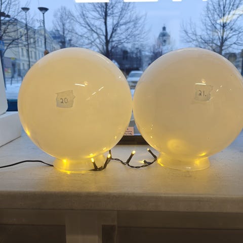 Rapunnumerokuutio 20x20cm 25e. Lisa Johansson-Papen kuvut seinävalaisimiin 20e/kpl. Erikokoisia pienempiä pallokupuja löytyy myös. Kysy tarkempia mittoja.