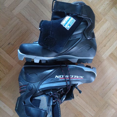 Salomon Vitane S -hiihtomonot naisille. Koko EU 39 (UK 6, US 7,5, sisäpituus noin 25 cm). Väri harmaa–keltainen. Monossa on nilkkaa tukeva takakappale ja kiristettävä remmi. Sivussa vetoketju helpottaa pukemista. Pohja on uritettu ja tarkoitettu perinteisen maastohiihtosidetyypin kanssa käytettäväksi. SNS pilotin side (kaksoisraudat).