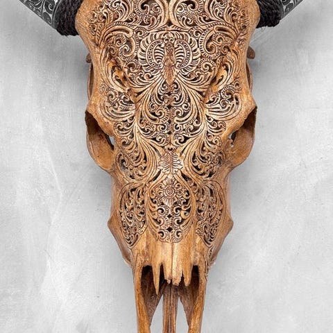 Tämä veistetty lehmän pääkallo on upea sisustuselementti, joka elävöittää minkä tahansa kodin tai ravintolan. Se ei ole vain henkinen ja kulttuurinen taideteos; se kertoo myös tarinan indonesialaisten alkuperäiskäsityöläisten perinteestä, jotka säilyttävät paikallisen käytännön käyttää jokainen osa eläimestä luodakseen ikuisen taideteoksen. Tämä pääkallo on käsityönä tehty Indonesiassa, missä kaiverrustaito eläinten pääkalloihin siirtyy isältä pojalle. He ovat hallitseet tätä ovelaa tekniikkaa ja tarvitsevat noin 5–6 päivää yksityiskohtaisten kaiverrusten, kuten tämän mallin, tekemiseen. Sarvet on myös veistetty boheemityylisesti.Kaiverrettu on kaunis tähtimandala-motiivi.Noinmiten mitatKorkeus: 57 cmLeveys: 61 cmVastuuvapauslausekePäähän on kiinnitetty kiristysnarusta, jotta se voidaan kiinnittää seinälle.- Sarvet irrotetaan kuljetusta varten, ja ne on helppo kiinnittää takaisin. Sarvet ovat aina pakattuna laatikon pohjalle, kallon alle. Varmista, että poistat sarvet ennen pakkauksen hävittämistä.- Koska kyseessä on luonnollinen kallo, siinä saattaa olla joitakin luonnollisia pieniä halkeamia, uurteita tai puuttuvia hampaita. Tämä on normaalia. Katso kuvat viitteeksi.- Kallomme puhdistetaan ammattilaisvoimin, mutta joskus hampaissa voi esiintyä pieniä värjäytymiä. Tämä on luonnollista ja normaalia, eikä siihen voida paljoa vaikuttaa. Katso kuvat.Olemme lisänneet kuvia käsityöläisistämme työssään antaaksemme kuvan siitä, millainen prosessi on kaiverratetun pään luominen.Ole hyvä ja huomaa, että nämä kuvat on otettu hämärässä studiosta, ja värit voivat vaihdella ympäristön mukaan.- JALUSTA EI SISÄLLYPaino, joka mainitaan, sisältää pakkausmateriaalin.LähetysKohde lähetetään seurantanumerolla DHL Parcelin, DPD:n tai postNlin kautta. Seuranta päivittyy Catawiki-luettelossasi, kun pakettisi on jätetty postiin.Ole hyvä ja tarkista säännöllisesti välttääksesi pakettisi palautumisen meille, jolloin ostaja vastaa toisen lähetyksen toimituskuluista.Seurantaan Espanjaan ja Portugaliin käytä tätä linkkiä ja lisää Catawiki-erästäsi saatu seurantanumero.https://clientesparcel.dhl.es/LiveTracking/HomeEMME YHDISTÄ TOIMITUKSIA!!!- Jos sinulla on kysyttävää paketistasi, ota yhteyttä meihin Catawiki-viestipalvelun kautta. Yritämme vastata kolmen työpäivän kuluessa.