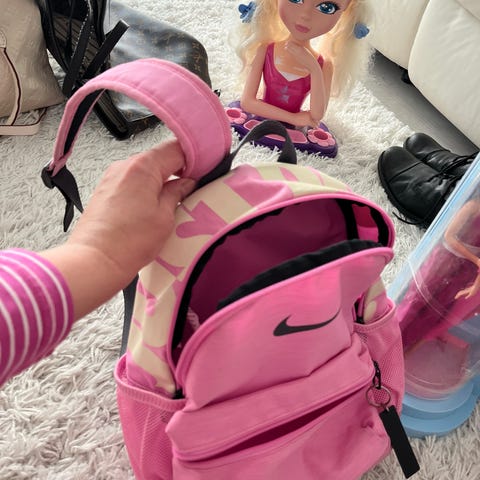 Kerho-, tai päiväkotirepuksi sopiva pieni reppu. Edestä varsin siisti, mutta olkahihnoissa jo tummentumaa. En ole pessyt reppua.