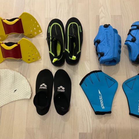 Aquajogger vesijuoksukengät, jotka soveltuvat myös vastusharjoitteluun vesivoimistelussa. Pehmeästä kelluvasta materiaalista valmistetut nilkkavastukset, joita voi käyttää vesijuoksuvyön kanssa tai pelkästään kelluttavana tukena. Väri sininen, mustat kiinnitysosat.