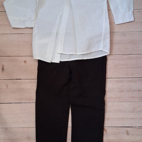 3. Kuvassa oikealla. Playzone ja Zalekua -housut pukukokonaisuus, koko 110; Housut mustat suorat, Liivi mustalla pohjalla valkoisia ommelpistoja. Kauluspaita pitkähihainen, kuosi valkoinen raita, jossa jonkin verran loistetta (satiini?). Rusetti samaa sävyä kuin liivi, mutta kuminauha on venähtänyt, tarvitsee vaihtoa. (kauluspaita on mahdollista vaihtaa asukokonaisuuden 2. olevan paidan kanssa halutessaan). HP 12€