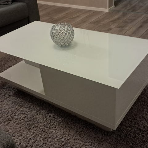 Valkoinen yleisilmeeltään siisti sohvapöytä. Lasissa naarmuja mutta niitä ei saatu kuviin. Yhdessä alakulmassa jälki
