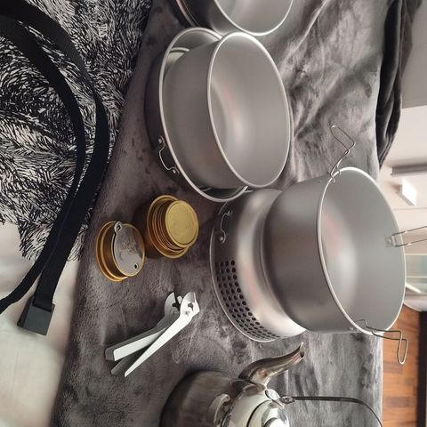 Kuvan retkeilytavarat vaikka retkeilyharrastuksen kokeiluun. Pari kahvallista kattilaa ja kansi sekä retkikeitin jo vähän elämää nähneitä, mutta olleet toimivia. Tuulisuoja ihan käyttämätön. Toimiva setti siis, mutta itselleni ei enää käyttöä uuden keitinpaketin myötä.