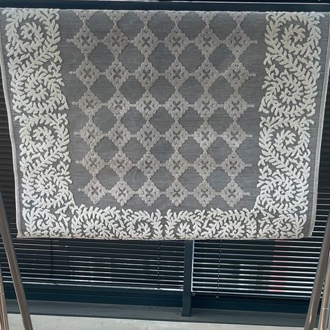 Vallilan ohut puuvilla-viskoosimatto vielä hyvä seuraavaan kotiin. Ei kulumaa, mutta yksi iso tahra kaipaa pesua. Ohje on laakavesipesu pesulassa 30C tai mieto saippuavesipesu.