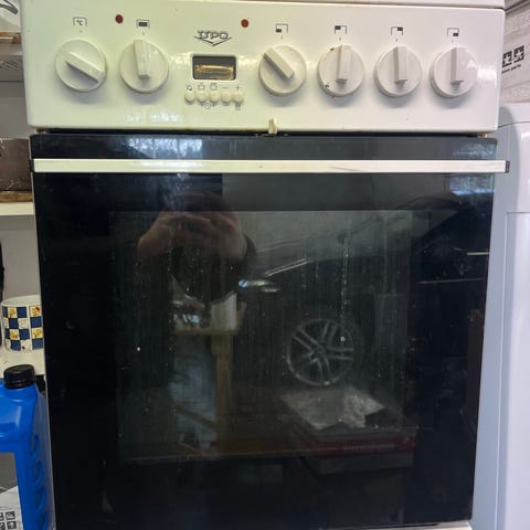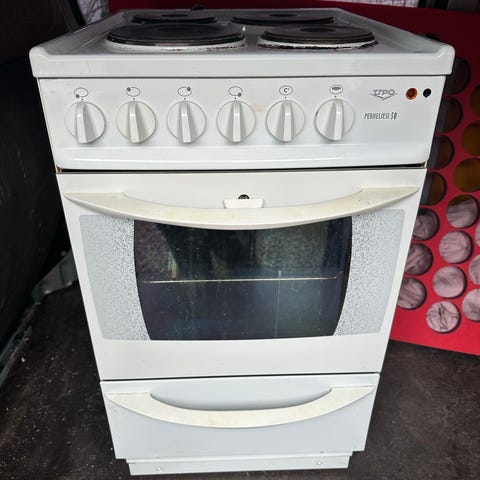 Upo liesi neljällä valurautaisella keittolevyllä ja uunilla. Vapaasti seisova malli, etupaneelissa mekaaniset säätimet levyille ja uunille. Uunissa ritilä ja alhaalla vetolaatikko tai säilytystila uunipelleille. Väri valkoinen. Mukana käyttöohje "Näin käytät Upo-liesiä" kuvien mukaisesti.