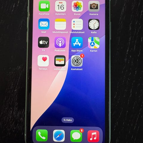Myynnissä Apple iPhone 11 64GB musta. Puhelin on ostettu 8/2023. Puhelimen akun kapasiteetti on 83%. Puhelimen etu- että takalasi ovat kunnossa, ei mitään naarmuja. Puhelimen kulmissa on kulumaa ja pientä rappeutumista myös alaosassa kaiuttimen kohdalla (näkyvät kuvissa). Puhelin on toimiva, kamera toimii ja kaikki kaiuttimet toimii. Kaupan päälle saa suojakuoret, jos haluaa.😊