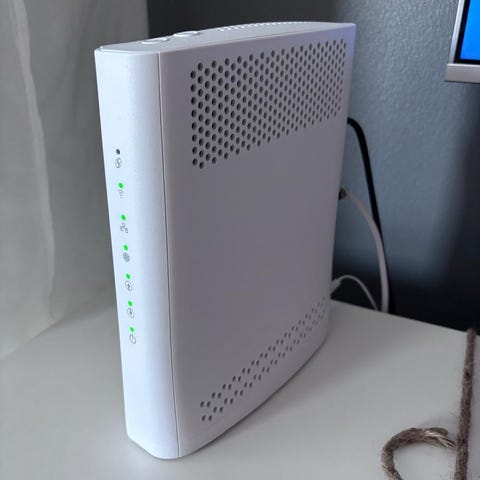 Laitteessa on useita Ethernet-portteja lähiverkkoyhteyksille, USB-portti sekä liitäntä kaapeliverkkoon. Sopii kiinteän laajakaistayhteyden jakamiseen usealle laitteelle kotona tai toimistossa. Mukana virtajohto ja verkkokaapeli kuvien mukaisesti.