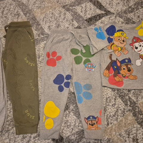 Kolme noin koon 104 paitaa: Lego Ninjago-kääntöpaljettipaita, Ryhmä Hau-paita ja monsteripaita. Moitteet näkyvät kuvissa.