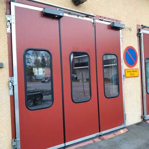 Vanhan palokunnan ovet. Ovi elementtejä 9kpl. Ekassa kuvassa "malli" miltä näyttävät asennettuina, ne ei ole myytävänä, vaan tokan kuvan ovi elementit joita 9kpl. Painavat. Mitat ovielementeille on; leveys n. 90cm ja korkeus n. 340cm