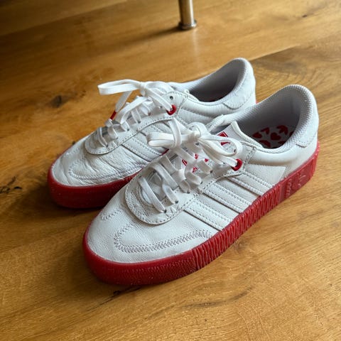 Adidas tennarit, koko 36,5. Sopii myös 37. (Itselläni 37 jalka). Väri valkoinen, koristeena monivärisiä sydänkuvioita