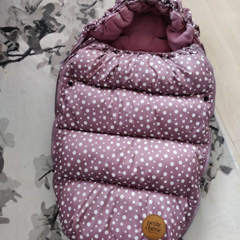 Petite Cherie lämpöpussi vaunuihin/rattaisiin. Irrotettava karvareunus, jonka yksi nappi irronnut muttei haittaa käyttöä. Vetoketjut toimii molemmin puolin.