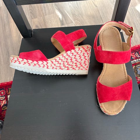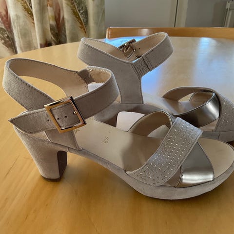 Gabor sandaalit, koko 37,5. Väri valkoinen. Mallissa on säädettävä nilkkaremmi soljella ja avoin kärki. Kiilakorko, jossa korkkipintainen ulkonäkö ja uritettu pohja paremman pidon takaamiseksi. Päällinen ja sisäpohja ovat pehmeät jalalle. Moitteeton kunto ja todella mukavat jalassa