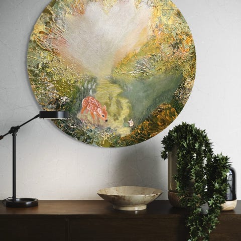 Tämä teos on herkkä ja kerroksellinen kuvaus kasvun turvasta ja yhteisön näkymättömästä tuesta. Maalauksen keskiössä on pieni peura, joka seisoo vasten pehmeää, lähes pyhää valoa. Se katsoo kohti tulevaa ja tuntematonta, täysin tietämättömänä siitä, kuinka moni silmäpari sitä todellisuudessa vartioi.