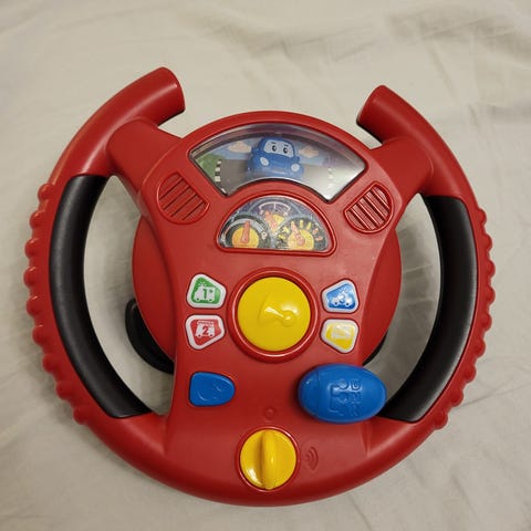 Punainen leluratti, josta tulee etilaisia ääniä. Lapsi voi liikuttaa rattia, laittaa vilkun päälle, vaihtaa vaihteita, kääntyä sivulle. Patterit täytyy vaihtaa