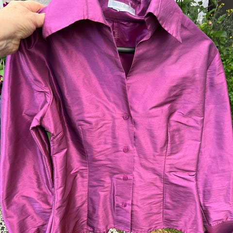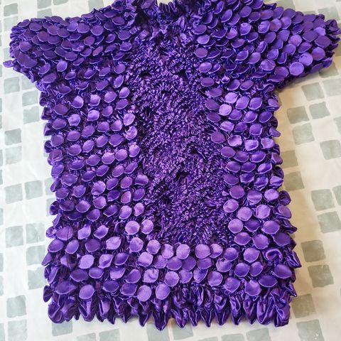 Kaunis violetti juhlava pusero, materiaalina viskoosi/elastaani, yksityiskohtina edessä, takana ja hihoissa pitsiä, paljettia ja helmiä.