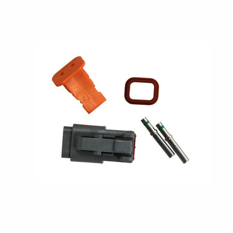 DT-2-liitin esim. lisävalojen kytkentään. Saatavilla UROS - ja NAARAS -puoliset liittimet. Komponentit irrallaan helpon kytkennän varmistamiseksi.