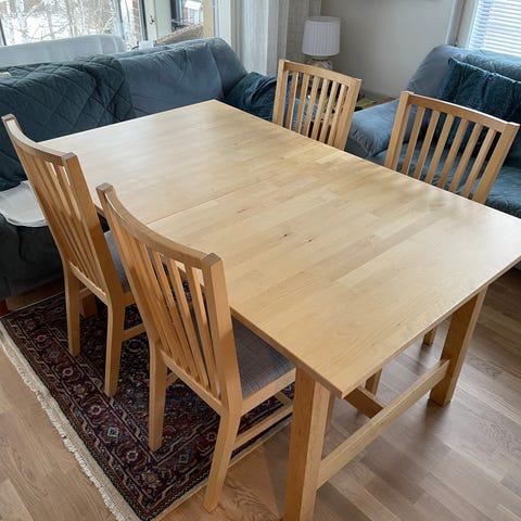 Ruokapöytä ja tuolit valkoinen siniset istuimet