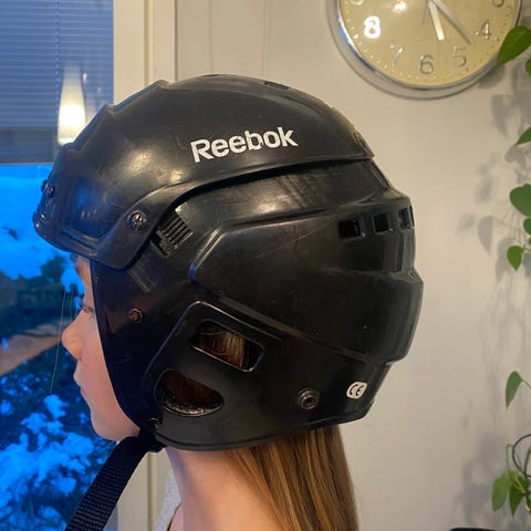 Reebok jääkiekkokypärä ristikolla. Koko 50–58 cm, sopii lapsille/pienipäisille käyttäjille. Väri musta. Kypärässä metallinen kasvosuoja/ristikko ja leukahihna. Soveltuu jääkiekkokäyttöön ja muuhun luisteluun, jossa tarvitaan pään ja kasvojen suojaa.