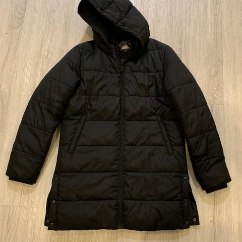 Zara toppatakki tytöille, koko 164 (noin 13–14-vuotiaille). Takki on musta ja siinä on kiinteä huppu. Edessä on vetoketju ja painonappikiinnitys sekä suuret etutaskut. Vuori on vaaleanpunainen. Vain nouto Kangasalta tai Tampereen Amurista