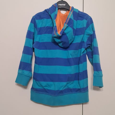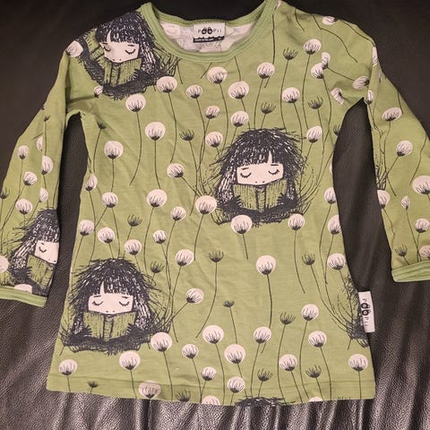 Uusi, siististi ommeltu pusero Paapiin luomutrikoota. Kankaat on esipesty ennen ompelua.