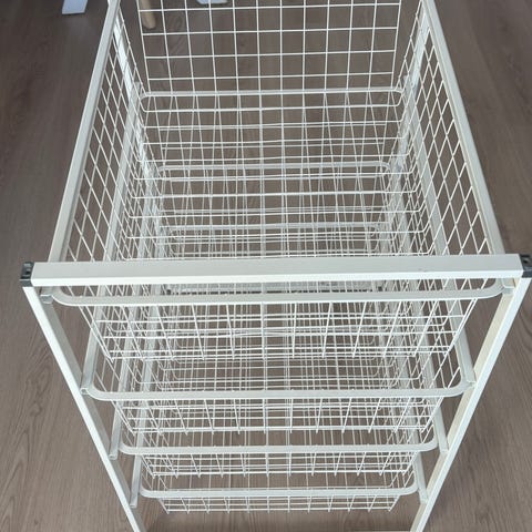 Myydään Ikean Antonius lankakorihyllykkö. Rungon mitat noin 44 (leveys) x 70 (korkeus) x 54 (syvyys). Neljä vetokoria. Useamman vuoden vanha, koreissa pientä kulumaa kiskojen kohdalla (kuva 2), mutta yleisilmeeltään siisti.
