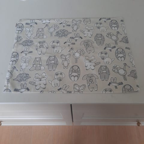 Siisti, mutta säilytyksestä ryppyinen. Ehjä ja tahraton. Vauvan pussilakana ja tyynynliina. Koko 85x125