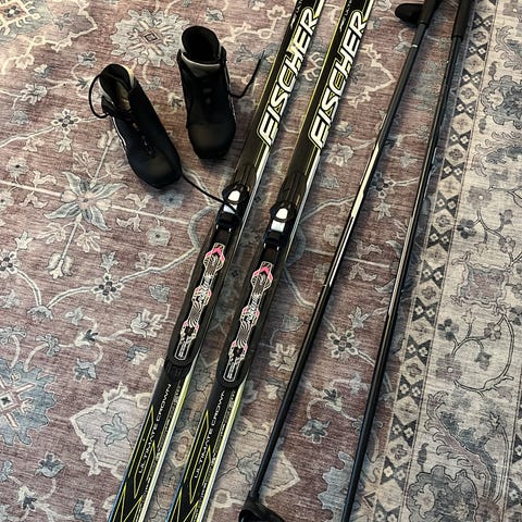 Fischer RCS lasten maastohiihtosukset 137 cm siteillä, sauvat 105cm ja monot