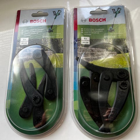 Bosch akkutrimmerin terät, yhteensä 25kpl. Viime kesänä ostettu. Uusia, käyttämättömiä. Nouto Tampereen Raholasta tai lähetyskulut ostajalle.